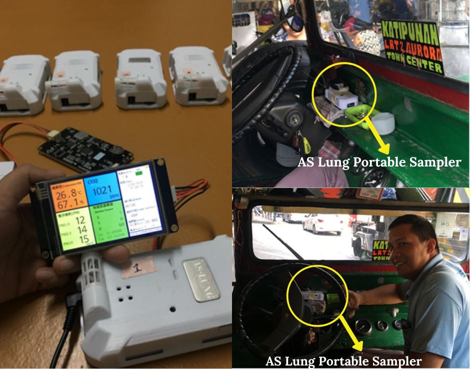Real-time PM2.5 personal exposure levels of 31 drivers plying a fixed 8 km route were recorded continuously for 10-12 hours each sampling from November 12 to December 15, 2018, yielding a total of 1061 complete circuits. Sampling results showed that the mean PM2.5 exposure concentration for all runs was 38 ฮผg m-3, about a factor of four greater than the mean annual PM2.5 guideline value (10 ฮผg m-3) set by the World Health Organization. Elevated levels of PM2.5 (hotspots) were also identified for the designated route, and these were consistently observed at intersections and across a shopping mall. The AS Lung Portable Samplers were attached to the jeepney dashboard within the driver’s breathing zone. Lower right: With Mr. Joe Ann Mendoza of the Katipunan-KMart Jeepney Operators and Drivers Association (KKJODA)